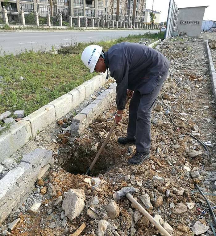 水喝夠了,一出辦公室看見一個熟悉的身影揮舞著鋤頭,他在干什么?一臉疑惑的我馬上跑過去,他已經滿頭大汗的還在一絲不茍的挖圍擋立桿基坑……