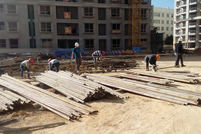 在這太陽高照、風(fēng)一吹到處都是塵土飛揚(yáng)的條件下,項目部退休返聘老職工材料主管李壽萍親自對現(xiàn)場的鋼管、扣件進(jìn)行收撿堆碼。一開始只有材料主管李壽萍及材料員劉小明在收撿,不一會兒項目經(jīng)理李朝松、技術(shù)負(fù)責(zé)人楊濤、主工長李兆林、工長劉忠全等管理人員看到這情景也陸陸續(xù)續(xù)加入進(jìn)來。管理人員們個個汗流浹背,人多力量大,不一會兒的功夫現(xiàn)場的周轉(zhuǎn)材料就堆碼完成。