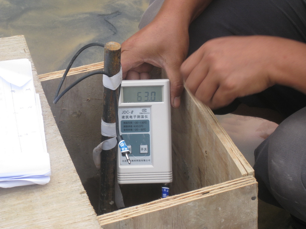 根據(jù)我公司大體積混凝土施工的成功經(jīng)驗,在澆灌混凝土之前編制了基礎大體積混凝土施工方案,采取優(yōu)化配合比設計、設置澆筑分倉縫,合理確定澆灌順序,保證筏板不出現(xiàn)冷縫,采用蓄水保溫養(yǎng)護法,并根據(jù)規(guī)范要求布置了7個測溫點。