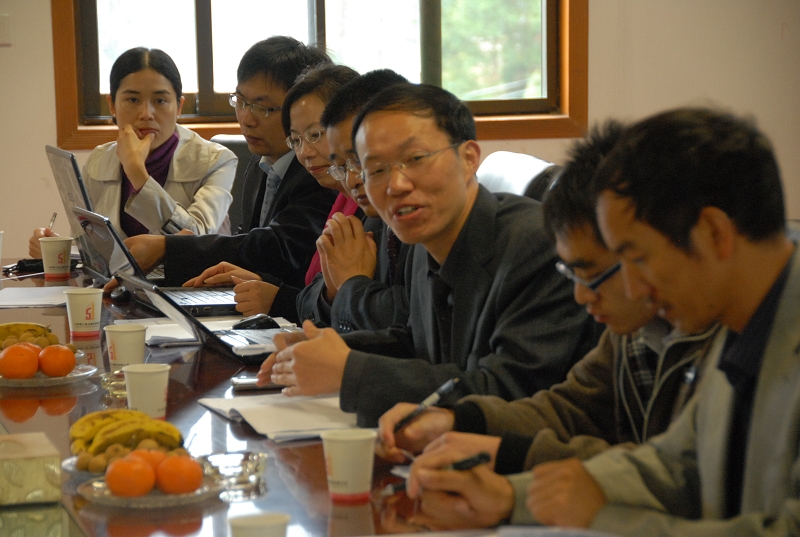 圖為公司總經(jīng)理方菊明在會上研討時場景