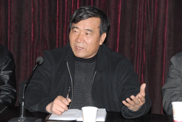 圖為楊福和在會上向內(nèi)退職工提出的問題作回應(yīng)
