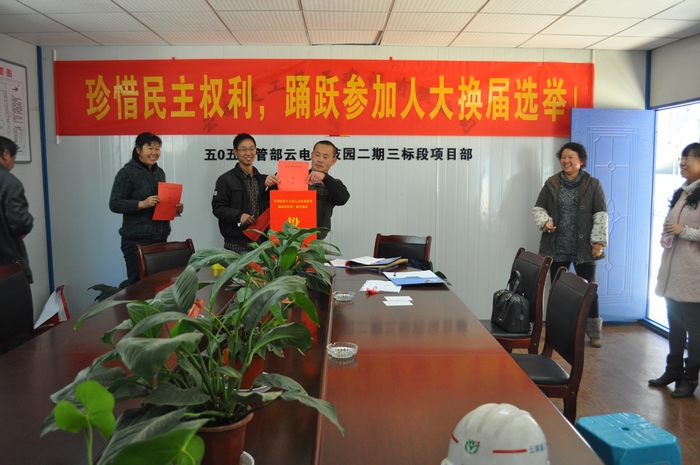 技術支持: 方森科技 2012年12月26日是五華區(qū)人大代表的選舉日,五〇五直管部作為眠山社區(qū)第一聯(lián)合選區(qū)第七小組,在選舉當日設置了流動票箱,分別在直管部辦公室、云電科技園項目部、嵩明錦繡蘭苑廉租房項目部進行了選舉。